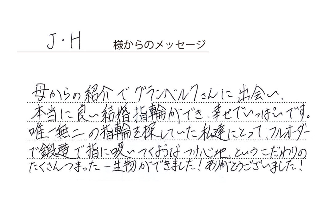 細くて丈夫な強度に優れた鍛造製法にてマリッジリングを製作しました。リング幅はそれぞれのお好みで、表面にはミラー仕上げを施しました。女性用の方には表面にダイヤモンドを一石あしらいました。「永遠に型崩れしない」ほど頑丈で特別な鍛造リングに仕上がりました。