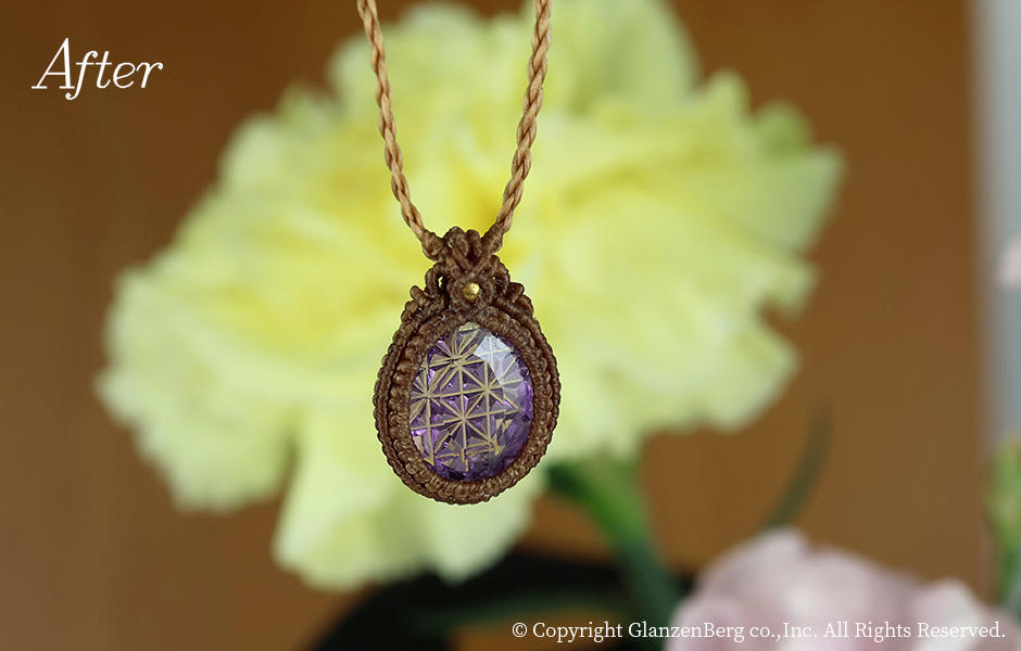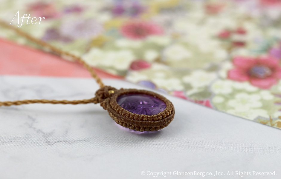 お義母様から譲り受けたアメジストの指輪をペンダントにリメイクしました。アメジストには現代の名工・深澤陽一氏による「甲州貴石切子」のカットを施し、肌当たりも優しいマクラメ編みにて製作しました。ナチュラルな風合いが様々なシーンでのお洒落にマッチします。
