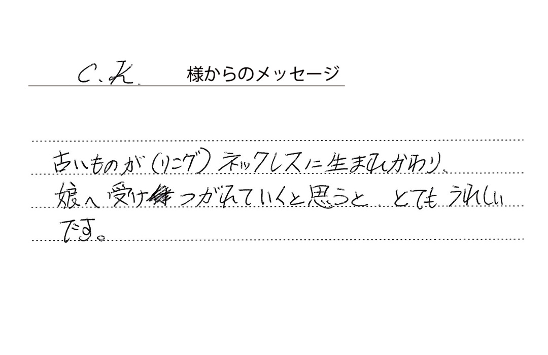作品No.3173 No.3173 リングをペンダントトップにリメイク 投稿日 2025年10月3日 更新日 2025年9月20日 著者 グランベルク タグ 色石 タグ カラーストーン タグ お客様の声 タグ 3173 After After After Before お客様の声 個性的なリングデザインを生かしてペンダントトップにリメイクしました。お嬢様へ受け継がれるジュエリーリメイクです。※残った地金をお取引(地金買取り)し、加工代(製作代)に充当しました。 ジュエリーリメイクについてのご相談はこちらから