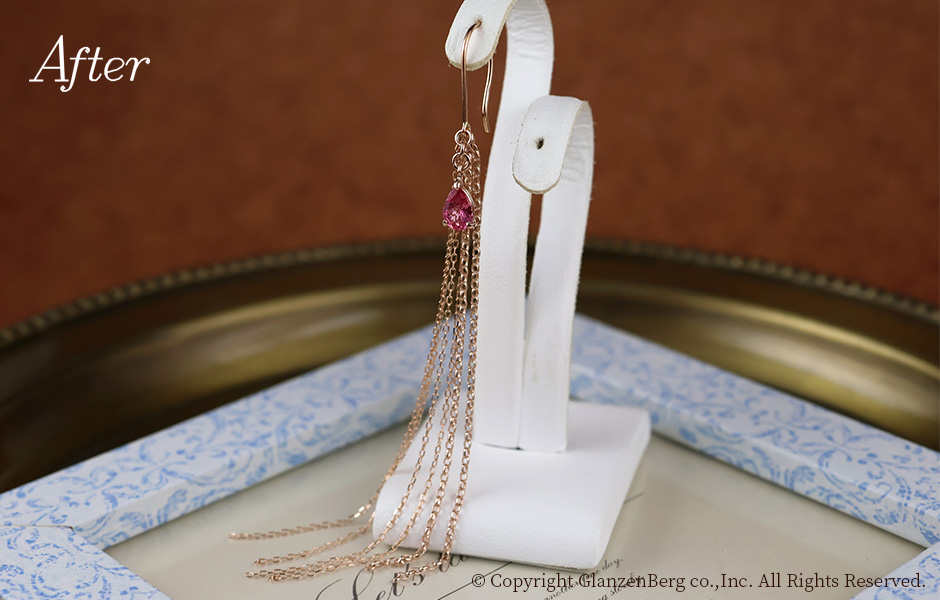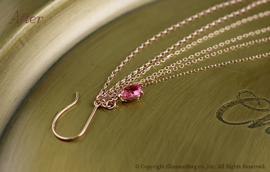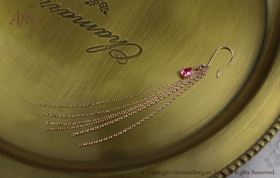 人気のピンクスピネルのルースをご購入いただき、シングルピアスを製作しました。鮮やかなピンクをさらに引き立たせるよう、18金ピンクゴールドにて加工いたしました。長めのチェーンとピンクスピネルを一緒にフックパーツにぶら下げ、風のようにしなやかなシングルピアスに仕上がりました。