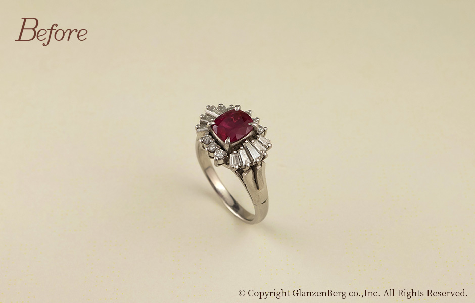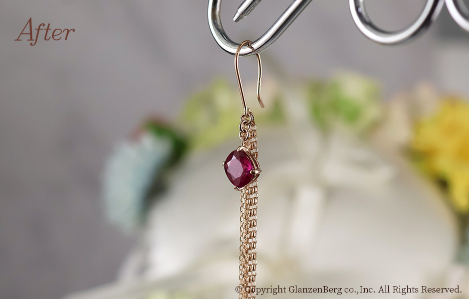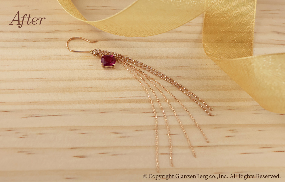 ご親族様から譲り受けたルビーの指輪をシングルピアスにリメイクしました。ピジョンブラッドに近い高品質のルビーを18金ピンクゴールドの石座にて加工いたしました。ピアスに添えた長めのチェーンが印象的です。ルビーの色と輝き、チェーンの長さのバランスが素晴らしい逸品です。