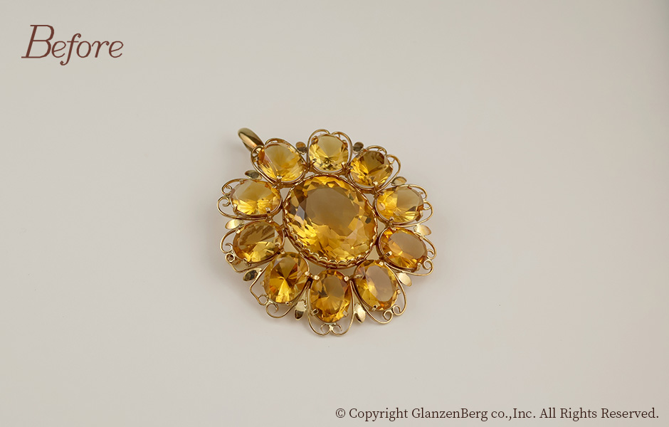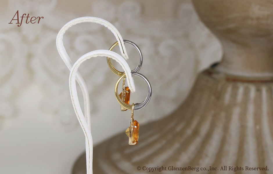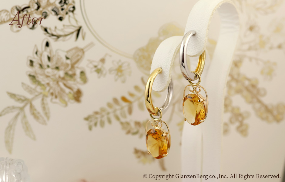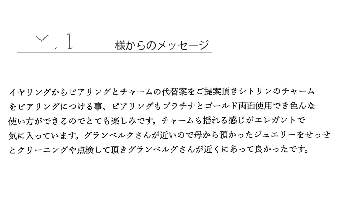 譲り受けたペンダントトップ兼ブローチを金具から着脱可能なチャームにリメイクしました。元の装飾デザインをそのまま残し、フープタイプのピアリングに着脱できるよう製作しました。ご家族でお揃いのピアスとチャームにお仕立てしました。