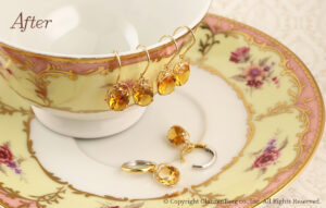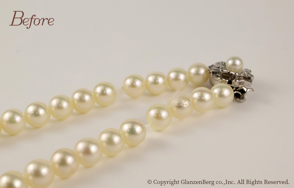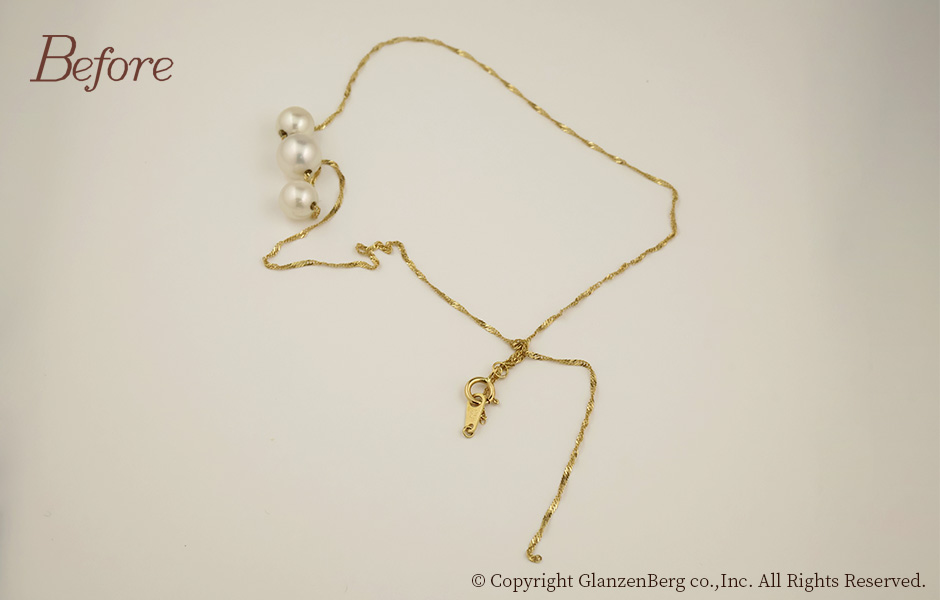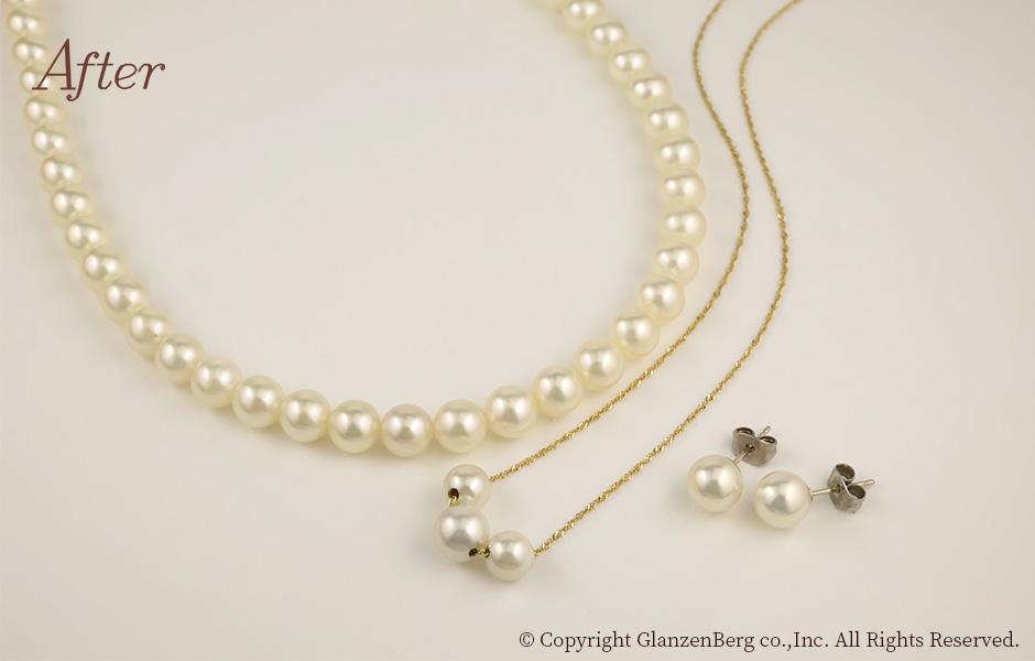 パールのチョーカーネックレスとピアス、ペンダントの修理をしました。ネックレスは伸びてほつれていた糸を替え、ハリのある状態に。ピアスは珠を接着し直しました。ペンダントは絡まりを解き、切れてしまっていたチェーンをつなぎました。ジュエリーは定期的に状態を点検することで、長くご愛用いただけるようになります。