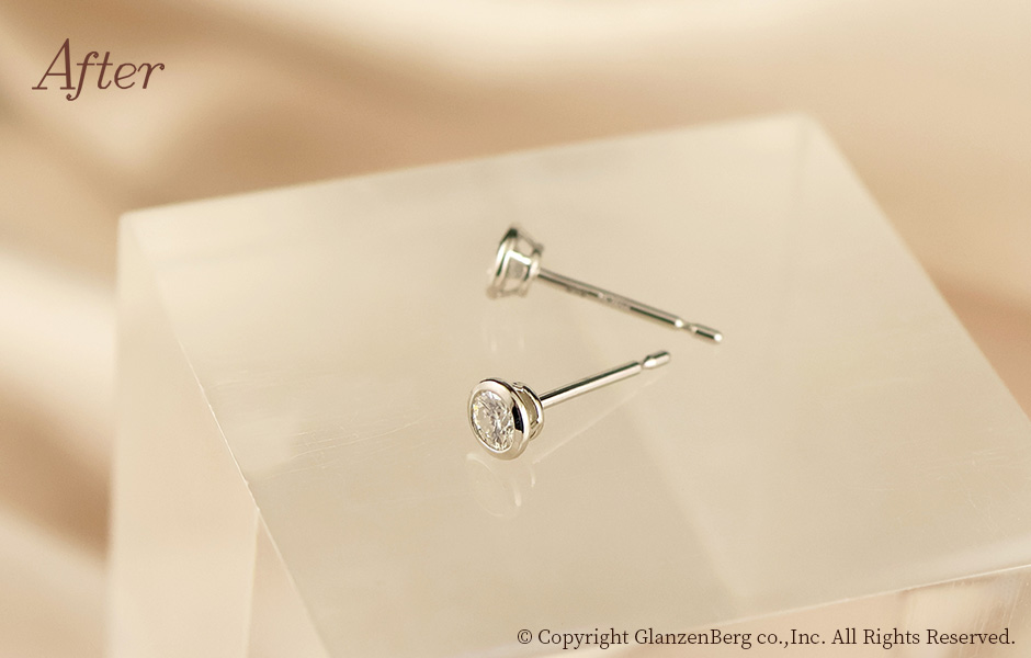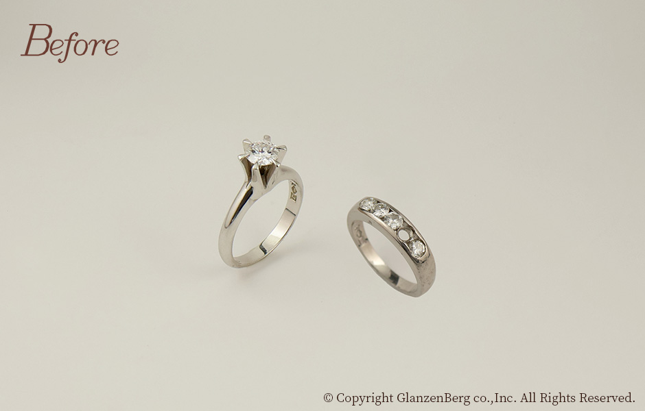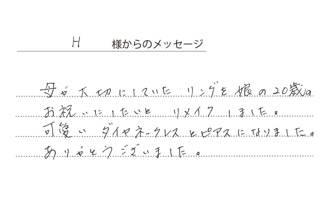 お母様が大切にされていた二つの指輪を使い、お嬢様の二十歳の記念にペンダントとピアスにリメイクしました。ペンダントトップとピアスはシンプルなお揃いのデザインです。お嬢様を想いながらデザインを考えられたお父様の姿が素敵でした。ご家族の絆を深めるアニバーサリーリメイクです。