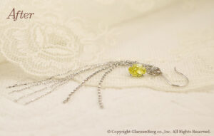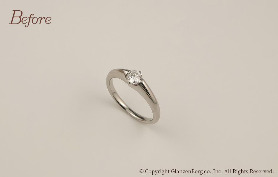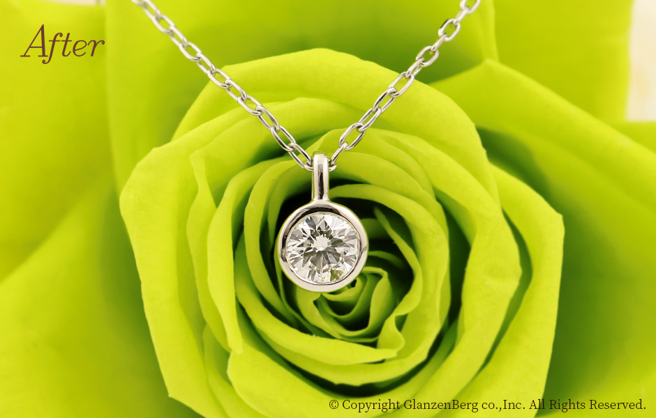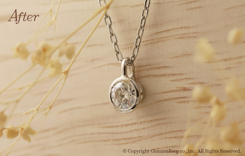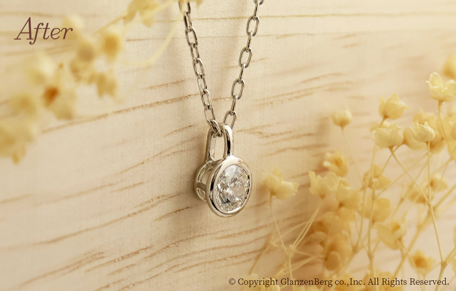 かつてご主人様から贈られたご婚約指輪のダイヤモンドを使い、ペンダントトップにリメイクしました。きわめてシンプルな6本爪のトップと、太すぎず細すぎない0.28㎜のチェーンのバランスが素敵です。あらゆるシーンでお使いになれるおしゃれなペンダントに仕上がりました。