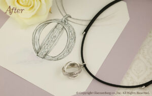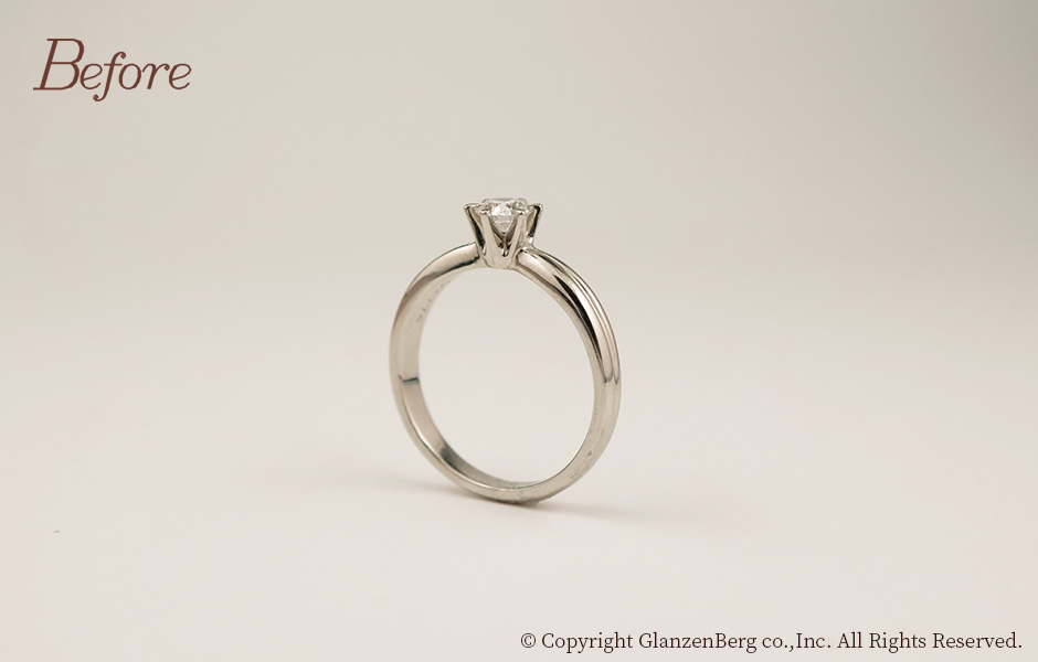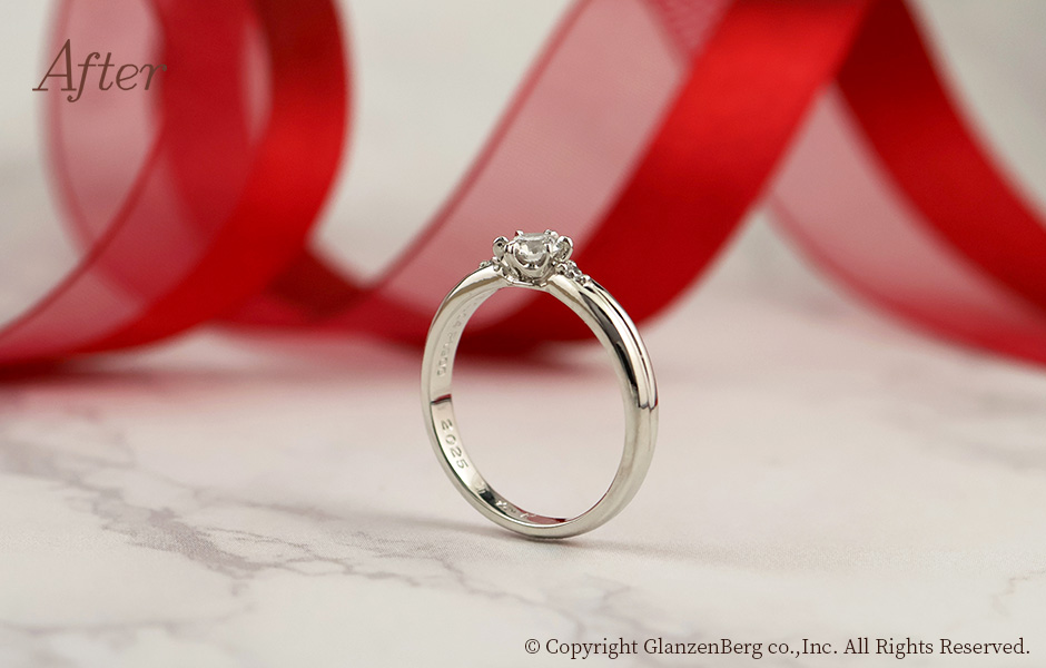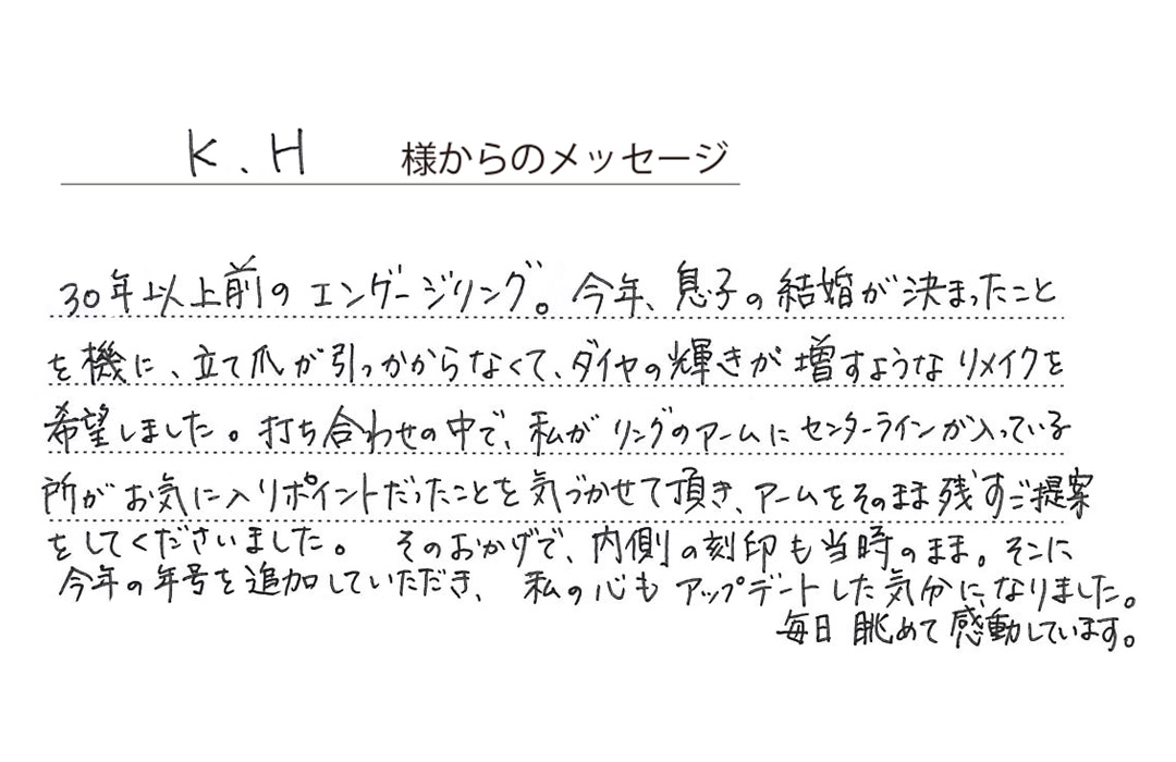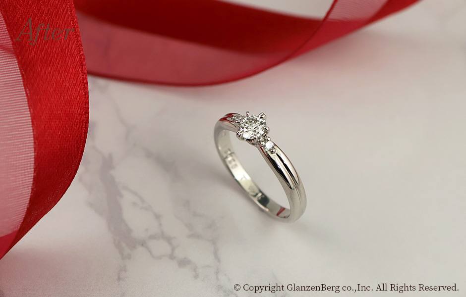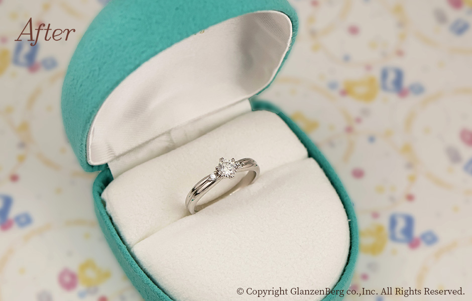 ご自身の婚約指輪のデザインはそのままに、石枠を繊細に造り替え、高さを抑えました。引っ掛かりが少なく身に着けやすいリングになりました。ご子息のご結婚を記念してのアニバーサリーリメイク。メレダイヤ(小粒のダイヤ)も2石追加し、素敵なリングに仕上がりました。