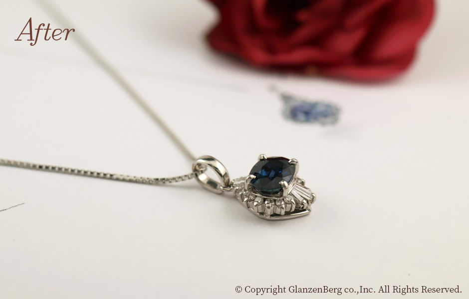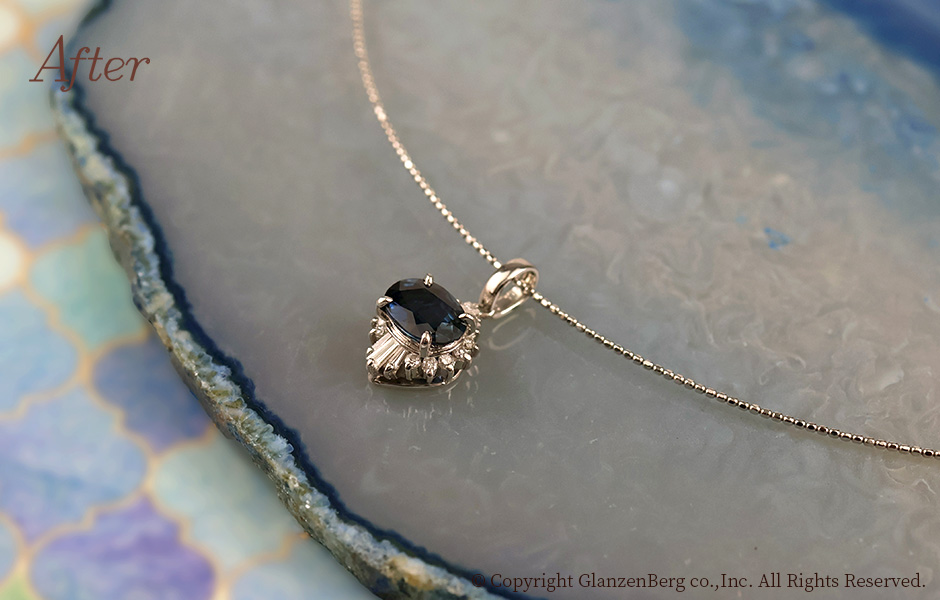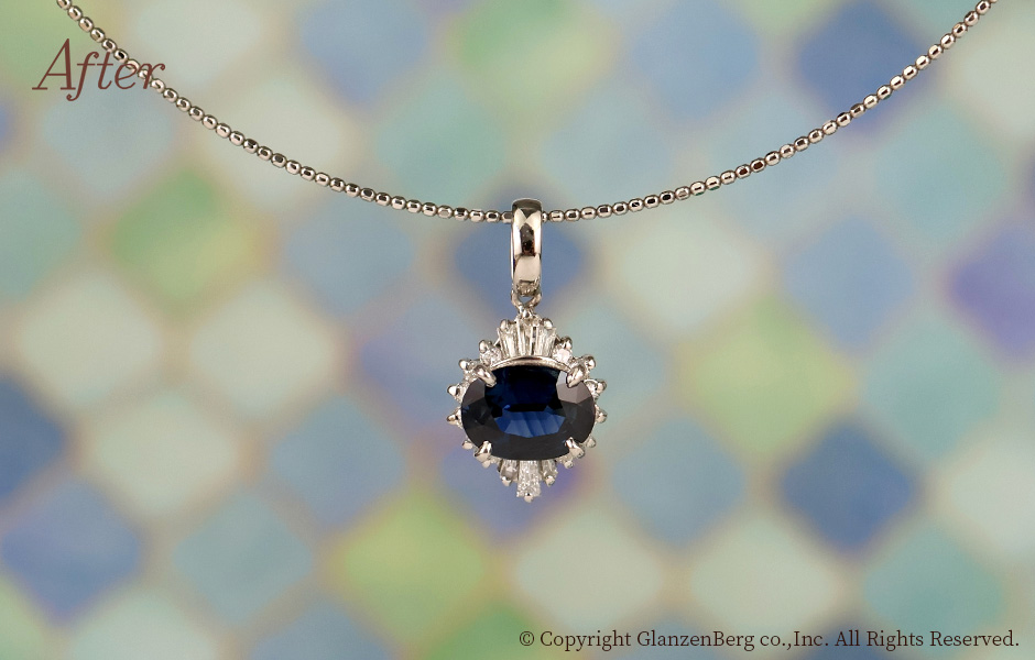 サファイアのリングを、元のデザインを生かしたペンダントトップにリメイクしました。お客様のアイデアで石を横向きに配置し、今までとは違う印象になりました。しなやかなワイヤーのネックレスに通すことでチョーカー風にお楽しみいただける仕上がりです。