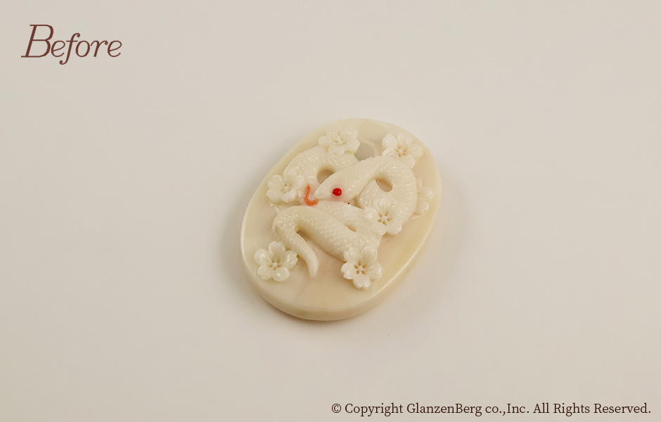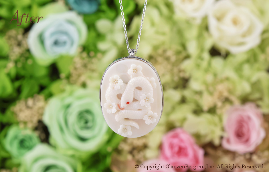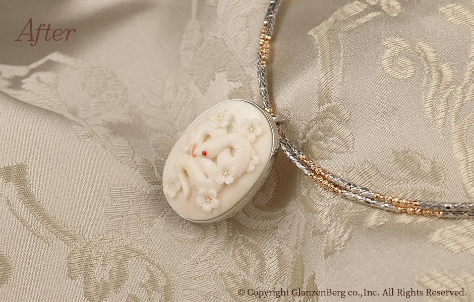 作品No.3220 No.3220 白サンゴのブローチ兼ペンダントを製作 投稿日 2026年1月4日 更新日 2025年12月22日 著者 グランベルク タグ 色石 タグ カラーストーン タグ さんご タグ 3200 タグ アニバーサリー タグ 誕生石 タグ SV タグ シルバー タグ 3月 After After After Before 還暦のお祝いにご自身の干支であるヘビのモチーフのブローチ兼ペンダントトップを加工しました。モチーフの珊瑚彫刻は高知県気鋭の職人・山本達也氏による逸品です。縁起の良い白蛇と桜が立体的に彫りだされた唯一無二の作品に仕上がりました。 ジュエリーリメイクについてのご相談はこちらから