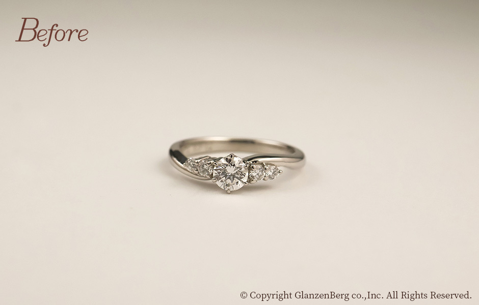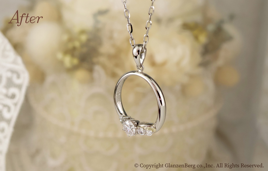かつてご主人様から贈られた婚約指輪をペンダントにリメイクしました。ダイヤの部分をデザインはそのままに角度を正面に回転させたデザインです。思い出のリングがペンダントに大変身。毎日ご愛用いただけるお品に仕上がりました。
