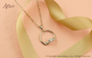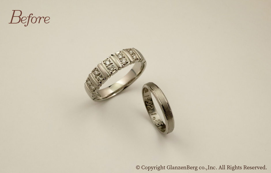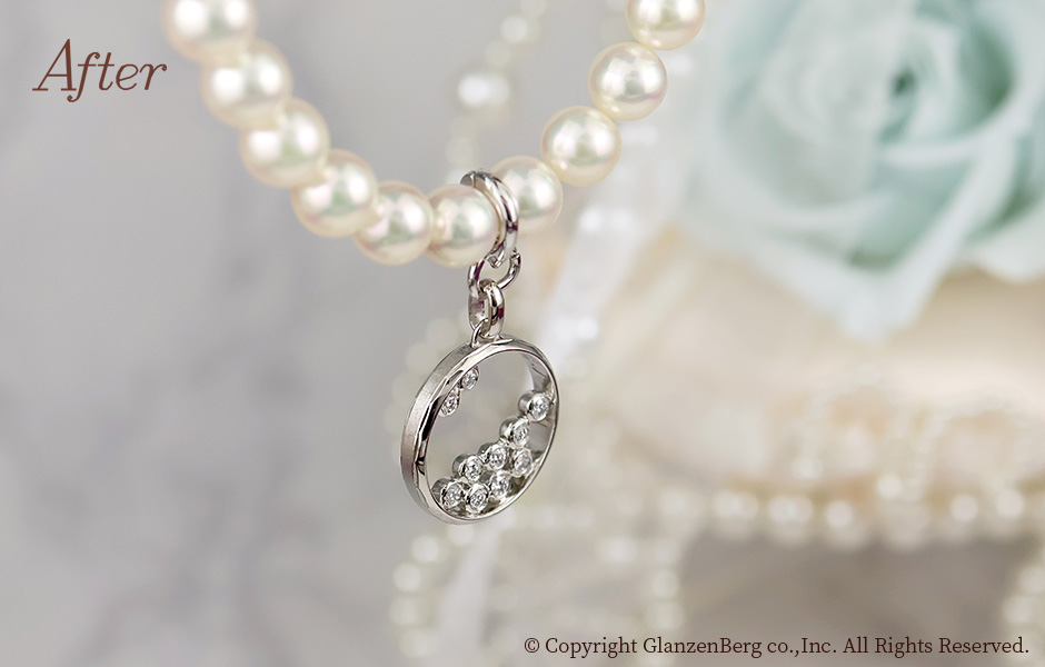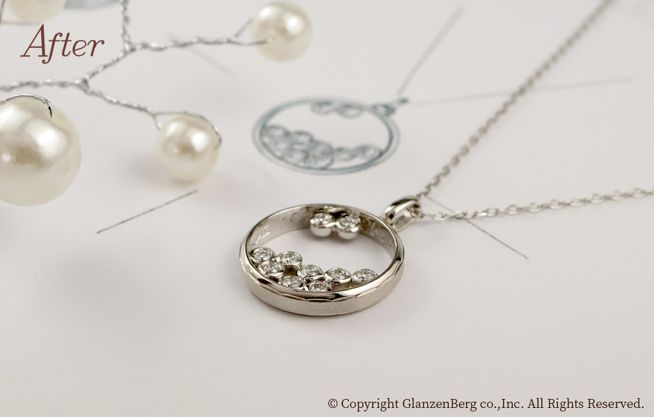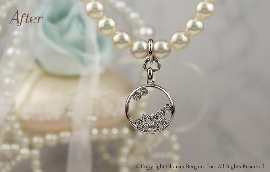 ファッションリングのダイヤをご主人様のマリッジリングに配置し、お嬢様が結婚式で身に着けるペンダントをしました。専用のパーツをご購入いただき、お祖母様から譲られるパールのネックレスにもジョイントしてお使いいただけます。ご家族から新生活をスタートされるお嬢様への素敵なアニバーサリーリメイクです。