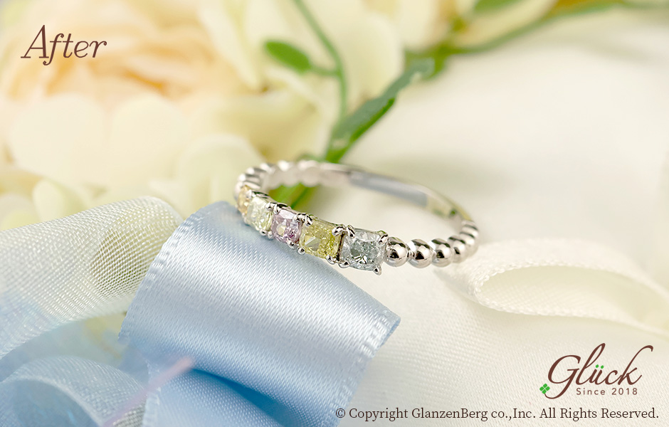 ナチュラルファンシーカラーダイヤ5石をご購入いただき、リングに加工いたしました。全て鑑別書付の極上のルースをお選びいただきました。5色のマルチカラーのダイヤモンドを左右にグラデーションになるよう配置し、地金部分に丸みを持たせた可愛らしいデザインです。ファンシーカラーが美しく際立つプラチナにて仕上げました。