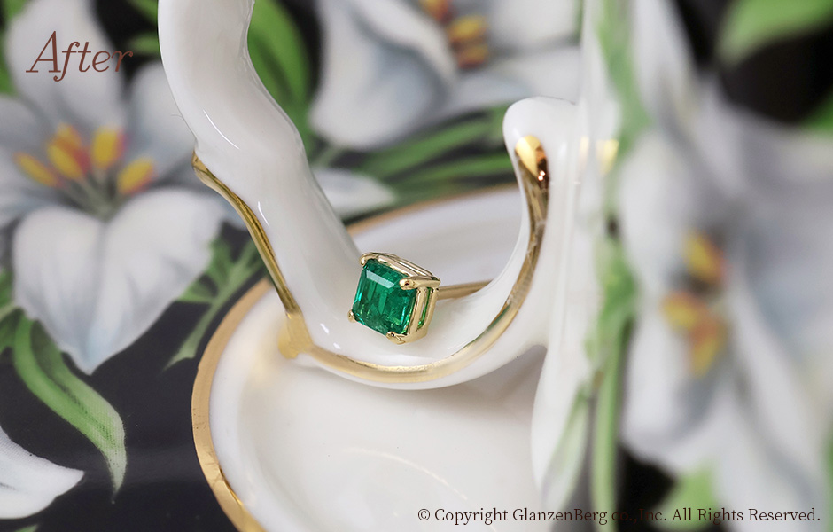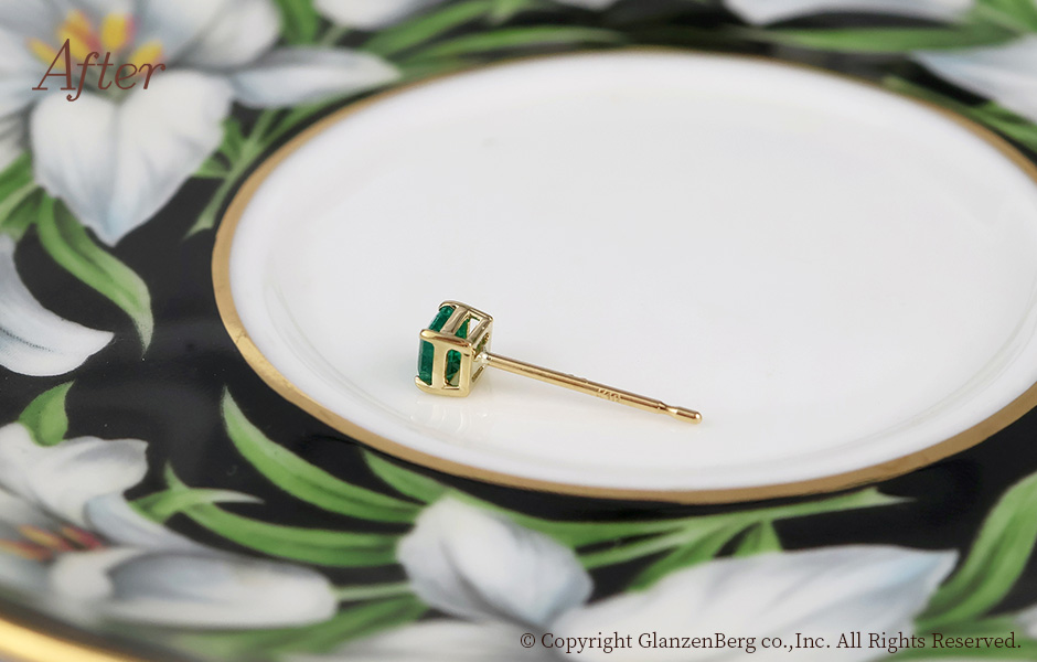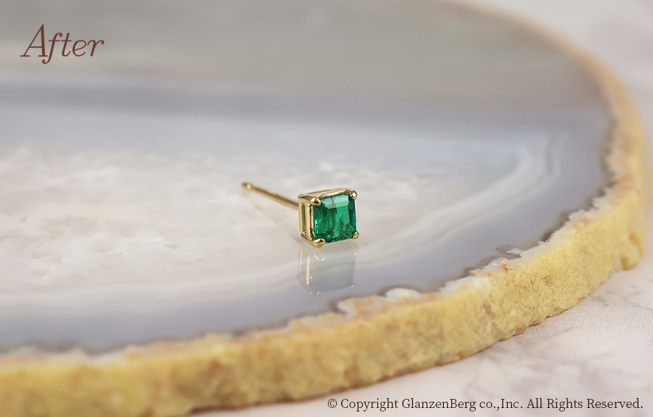 ブローチ兼帯留めについていたエメラルドを外し、シングルピアスに加工しました。鮮やかな緑と相性の良い18金イエローゴールドを使用しました。複数着けにも最適なきわめてシンプルなピアスに仕上がりました。
